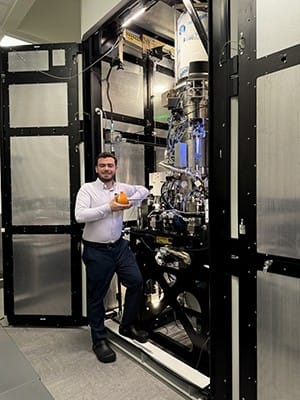 Most days, Marchese spends his time at Argonne National Laboratory, which UChicago manages for the U.S. Department of Energy. There, he uses the Spectra Ultra X Iliad, an advanced scanning transmision electron microscope that enables Marchese to understand the engineering limitations of existing batteries and the potential of sodium borohydride by studying its chemical reactions with various metals on the atomic scale.